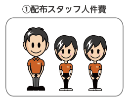 街頭配布業務に従事するスタッフの人件費です。配布スタッフのチーム構成としては、街頭配布現場を管理する「配布管理スタッフ」、現場の配布業務をサポートする「配布アシスタントスタッフ」、配布業務を行う「配布スタッフ」の3種類のスタッフを組み合わせて構成します。